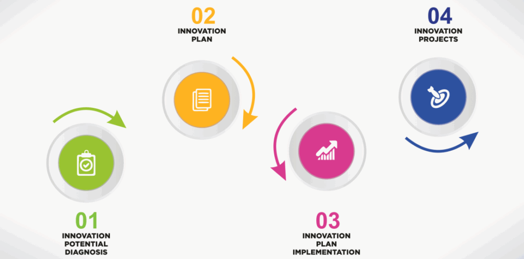 The innovation process within a company is often chaotic and uncoordinated under the pretext of creativity. However, many companies shy away from taking the step towards a structured process. However, dealing with internal processes and structures within the company offers an opportunity to secure the company’s ability to innovate in the long term and to establish an independent innovation management system.